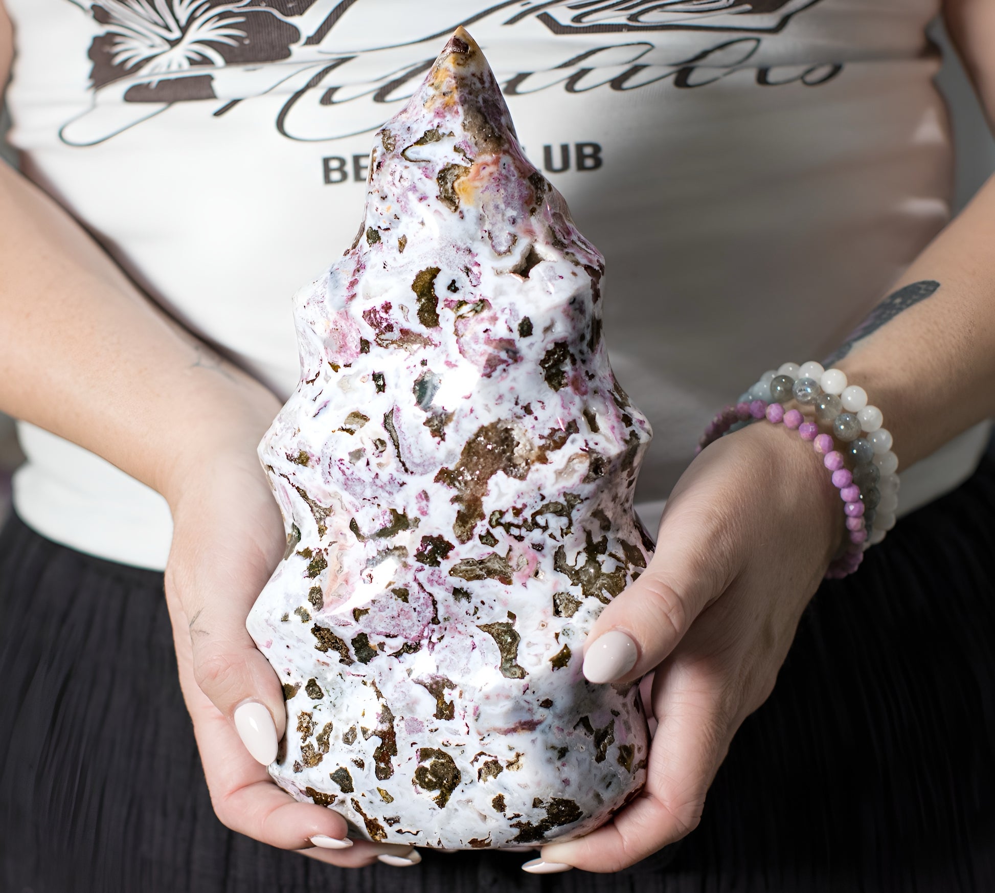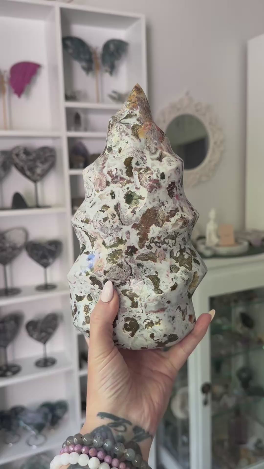 Ocean Jasper is known for its deeply soothing, uplifting vibration. It carries calming oceanic energy that supports emotional healing, joy, and inner renewal. The flame carving symbolises transformation, strength, and rising light, making this piece not only visually striking but energetically powerful within any sacred space or home.