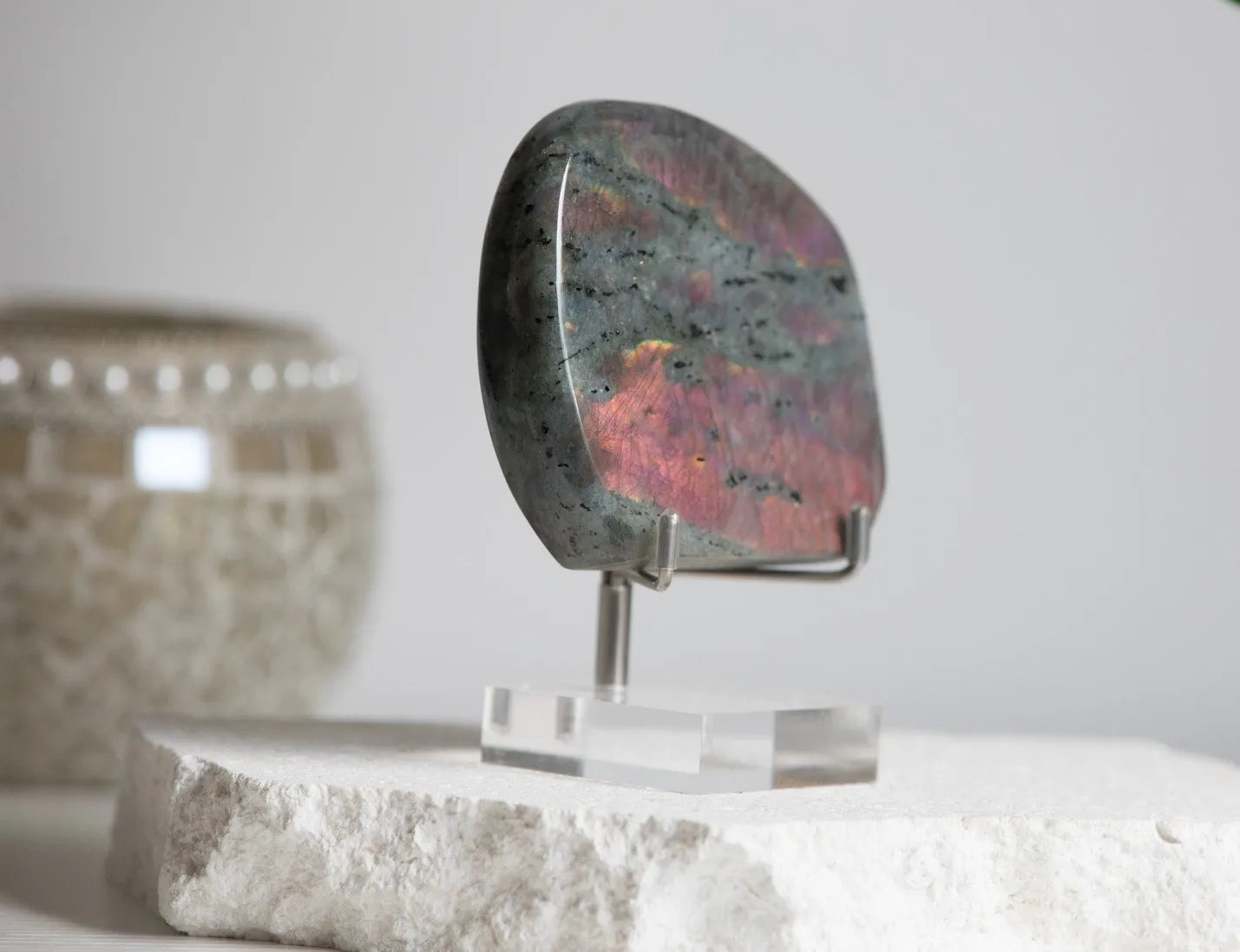 Labradorite is a stone of transformation and protection. It enhances intuition, creativity, and spiritual vision while helping release fear and self-doubt. The purple flash adds a higher spiritual vibration, supporting awakening and inner strength.